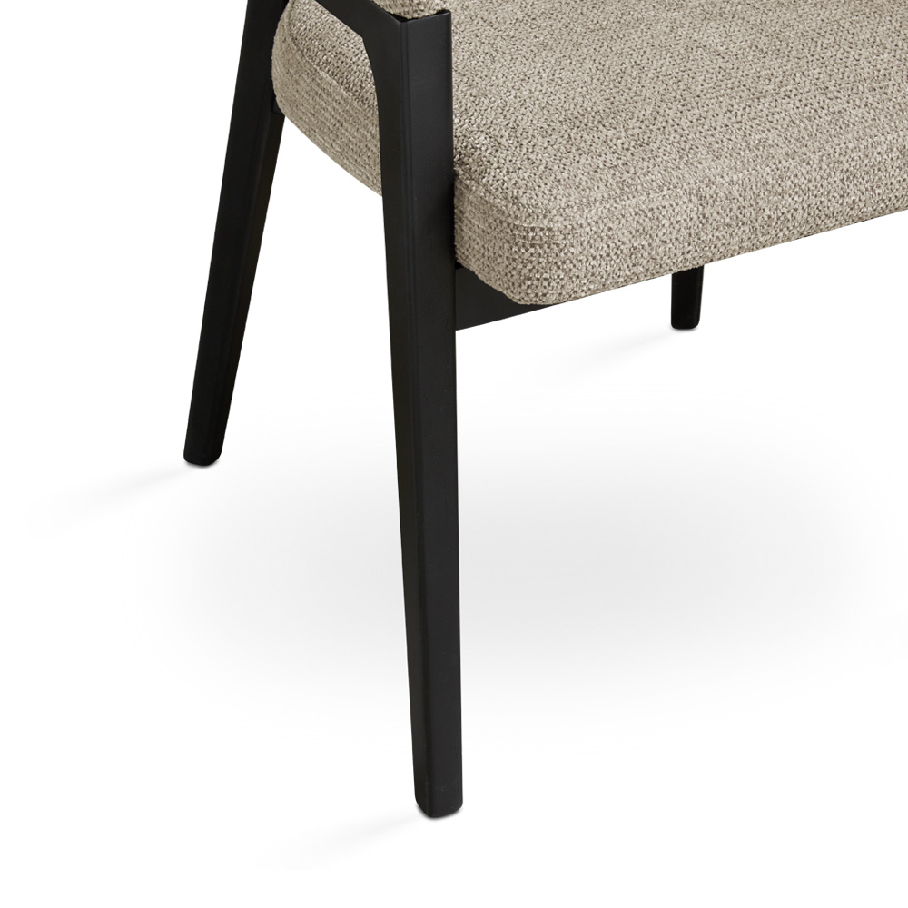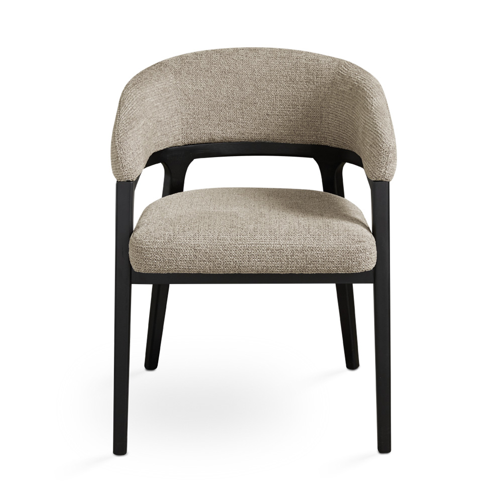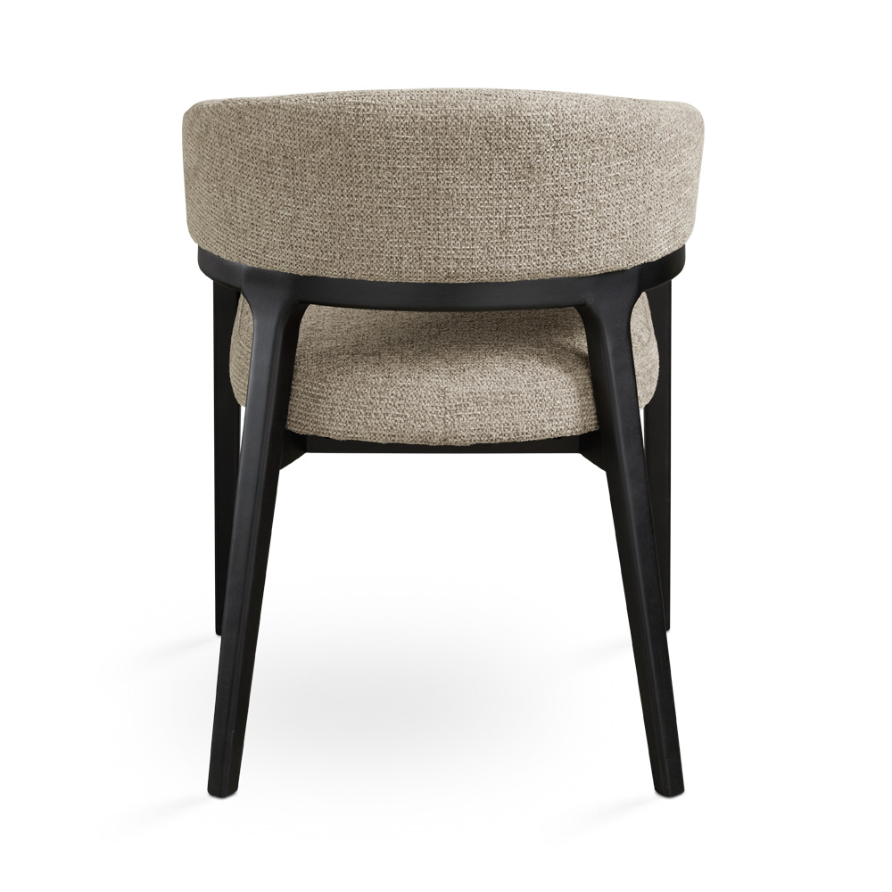 The Chanler Dining Chair pairs a gently curved backrest and open lower back with a tailored taupe linen upholstery, creating a balance of comfort and modern refinement. Its sculptural solid wood frame, finished in a dark stain, provides both stability and contrast. Ideal for dining spaces that require a soft visual presence with structural integrity.