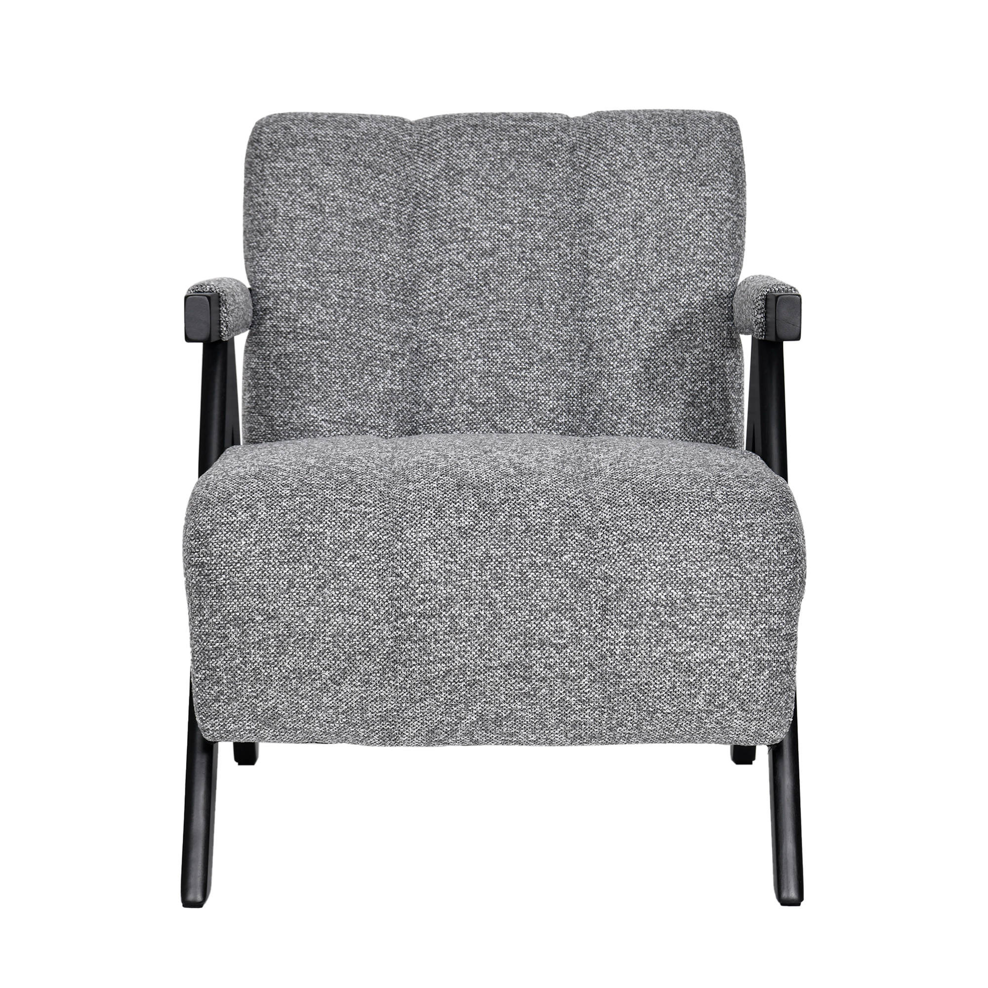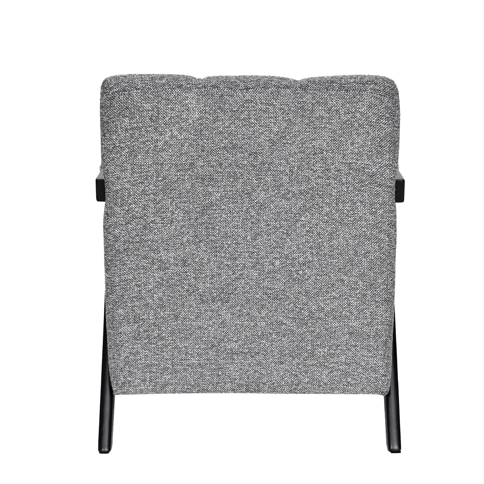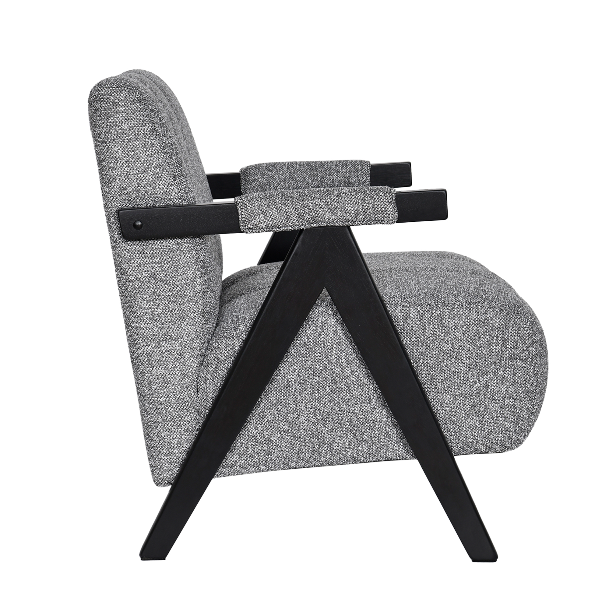This contemporary accent chair features a distinctive angular black wooden frame that creates bold geometric lines, upholstered in premium heathered gray textured fabric for exceptional comfort. The unique A-frame leg construction with integrated armrest support offers superior stability while making a striking visual statement in any space. Built with contract-grade materials, this piece is ideal for commercial environments, executive offices, reception areas, and modern residential interiors. The sophisticated neutral palette and compact footprint complement both minimalist and industrial design schemes perfectly.