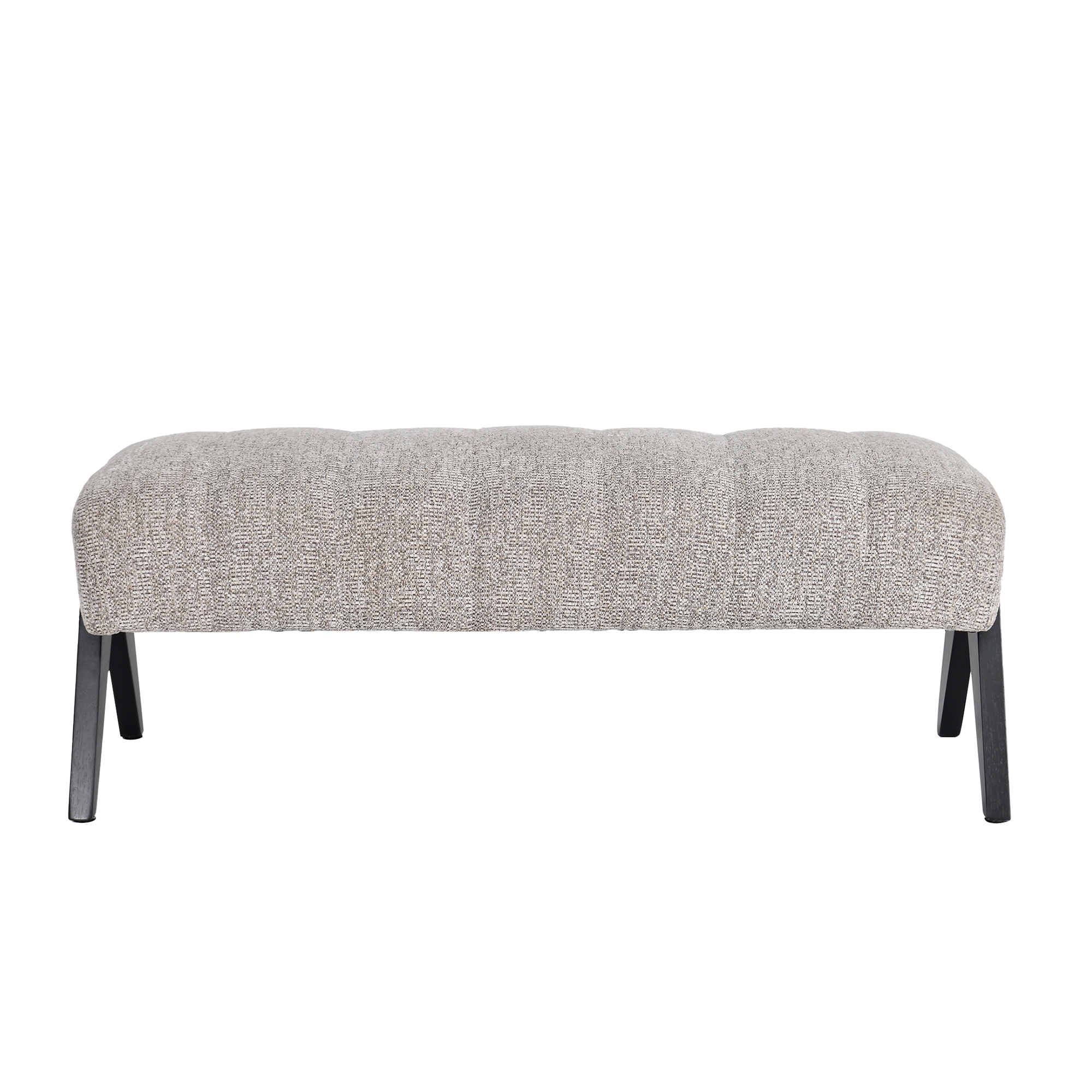 This sleek contemporary bench features a distinctive angular black wooden frame that creates bold geometric lines, upholstered in premium heathered gray textured fabric for comfortable seating. The unique A-frame leg construction offers superior stability while making a striking visual statement, perfect for entryways, dining spaces, or commercial waiting areas. Built with contract-grade materials and generously cushioned for comfort, this versatile piece complements both minimalist and industrial design schemes. The sophisticated neutral palette and clean lines make it ideal for modern residential and commercial interiors.