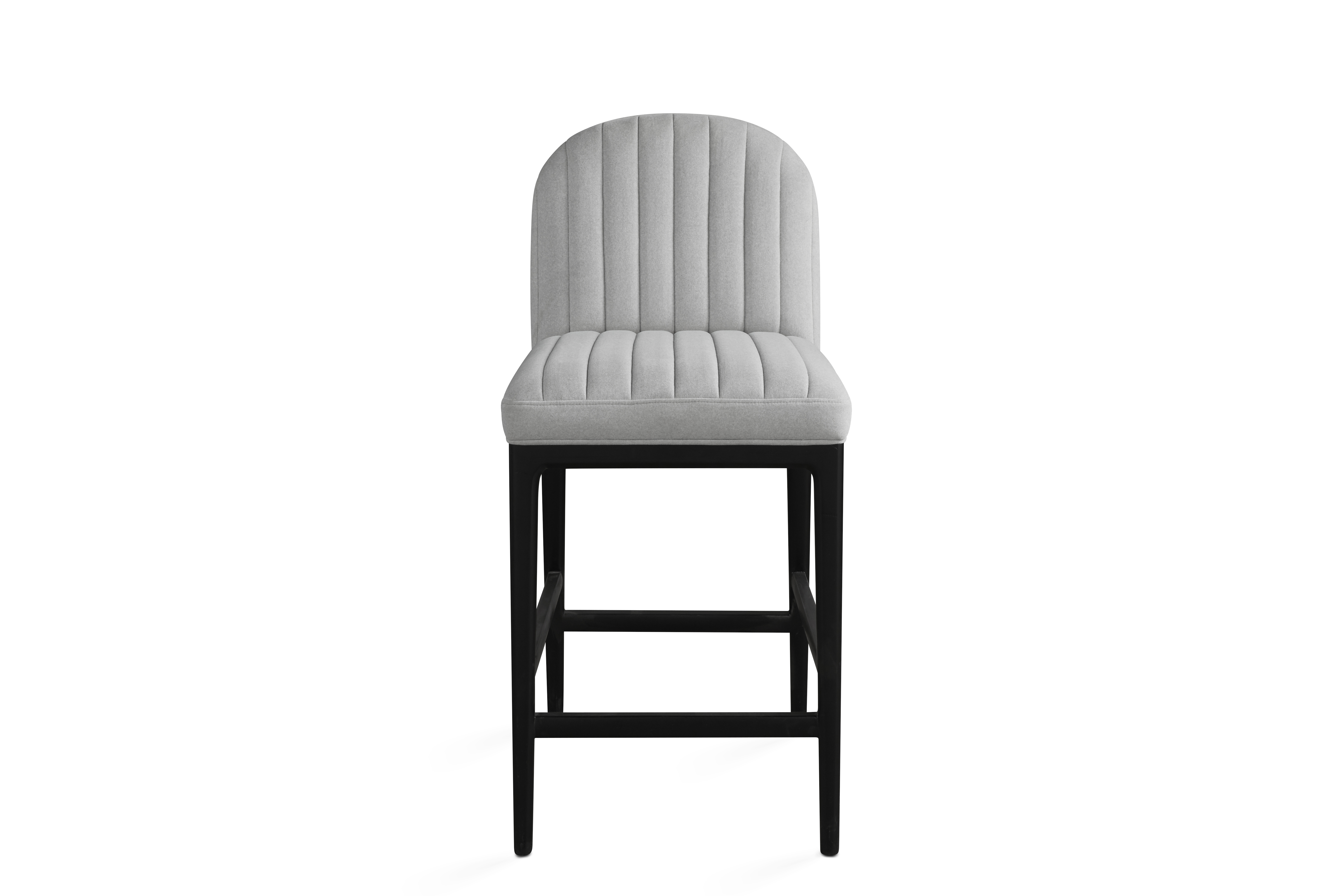 This sophisticated counter stool features distinctive vertical channel quilting in premium light gray fabric, creating elegant texture and superior comfort for extended seating. The sleek black metal frame with integrated footrest provides excellent support and stability, making it ideal for kitchen islands, bar areas, and commercial establishments. Built with contract-grade materials and refined craftsmanship, this versatile stool seamlessly combines modern aesthetics with exceptional durability for high-traffic environments. The neutral color palette and timeless design make it perfect for contemporary restaurants, hotels, and upscale residential spaces.