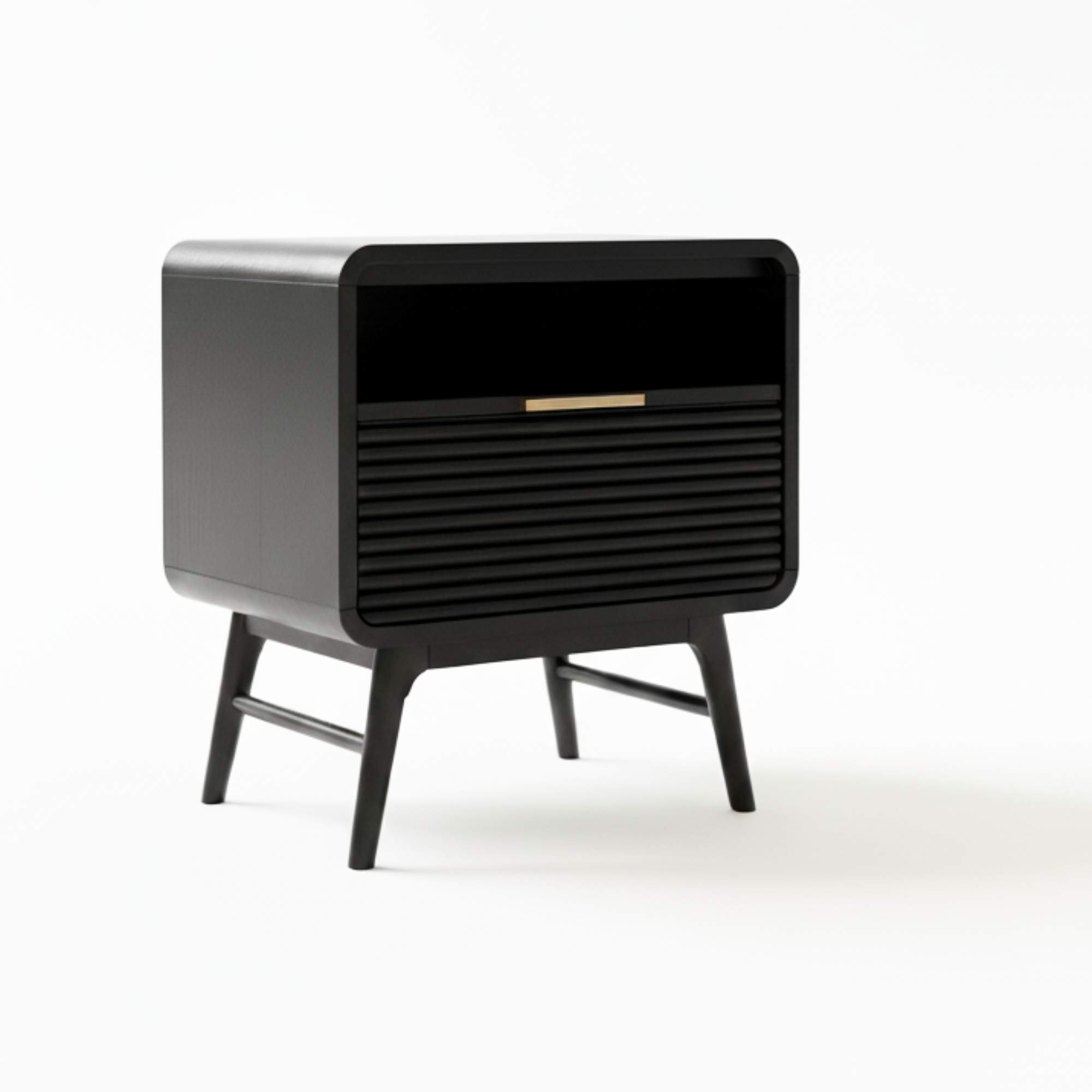Sleek, modern, and quietly elegant, the Laura Nightstand is a statement of refined minimalism. Designed with smooth, rounded edges and a deep matte black finish, it brings a touch of sophistication to any bedroom. The ribbed drawer front adds subtle texture and visual depth, while the gold-toned handle provides a hint of luxury. A spacious open shelf offers easy access to nighttime essentials, while the soft-closing drawer keeps clutter neatly tucked away. Resting on tapered legs, the Laura Nightstand maintains a light, airy profile that complements both contemporary and mid-century interiors.