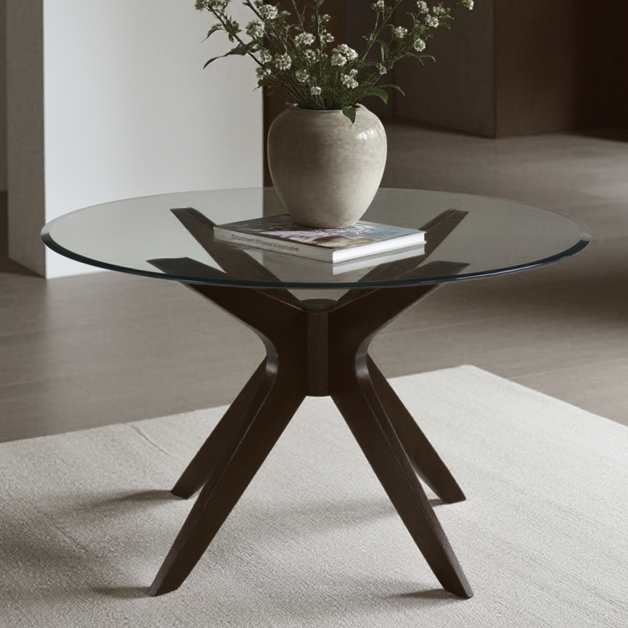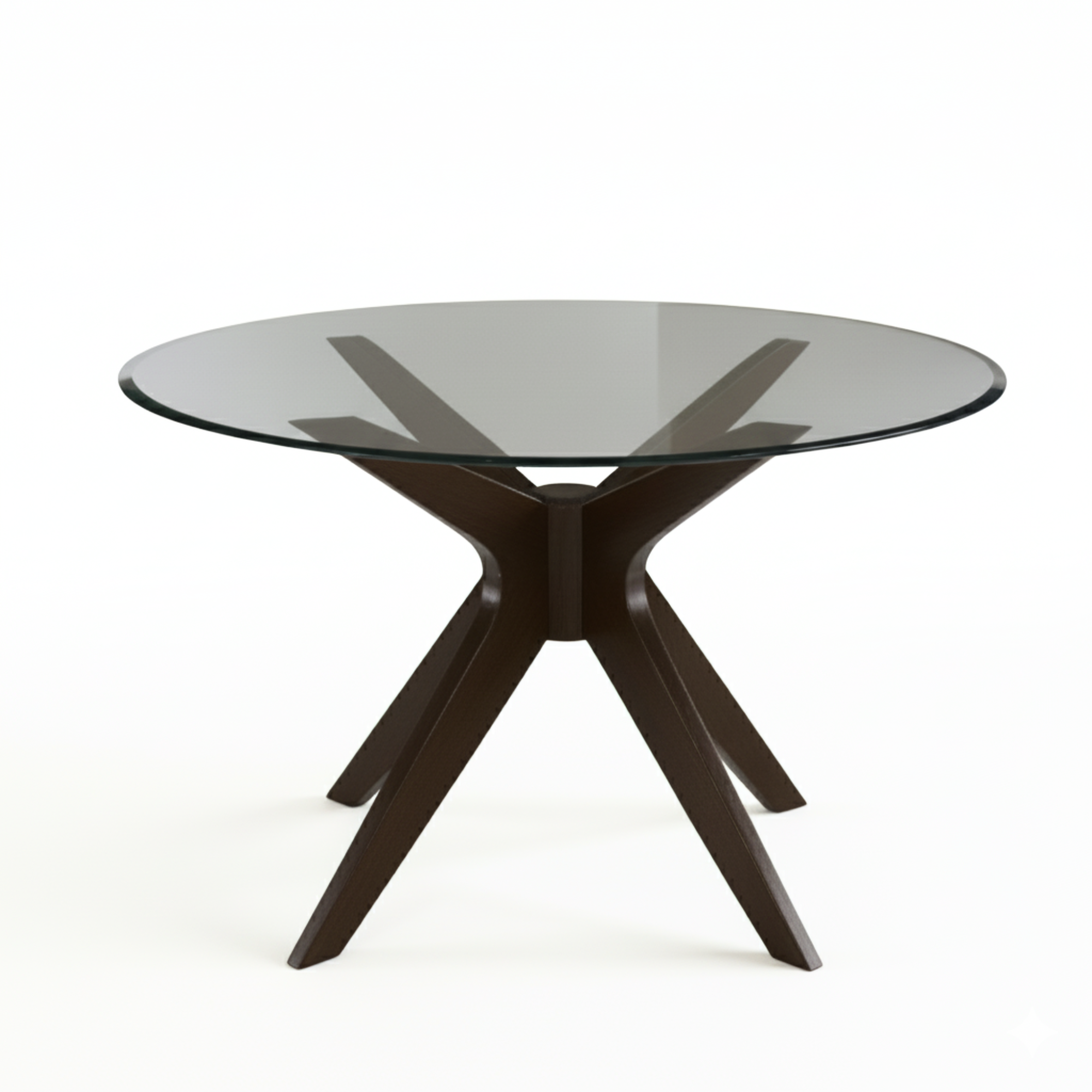 This contemporary dining table features a sleek transparent glass top paired with a striking sculptural black star base that radiates from the center, creating visual lightness and architectural sophistication. The unique splayed leg design provides exceptional stability while remaining fully visible through the glass, showcasing the geometric artistry of the base structure. Built with tempered glass and solid wood construction, this statement piece combines modern elegance with airy openness, perfect for smaller spaces or design schemes requiring visual flow. The transparent top and dramatic black base make it ideal for contemporary restaurants, boutique hotels, executive dining rooms, and upscale modern interiors seeking a refined yet bold centerpiece.