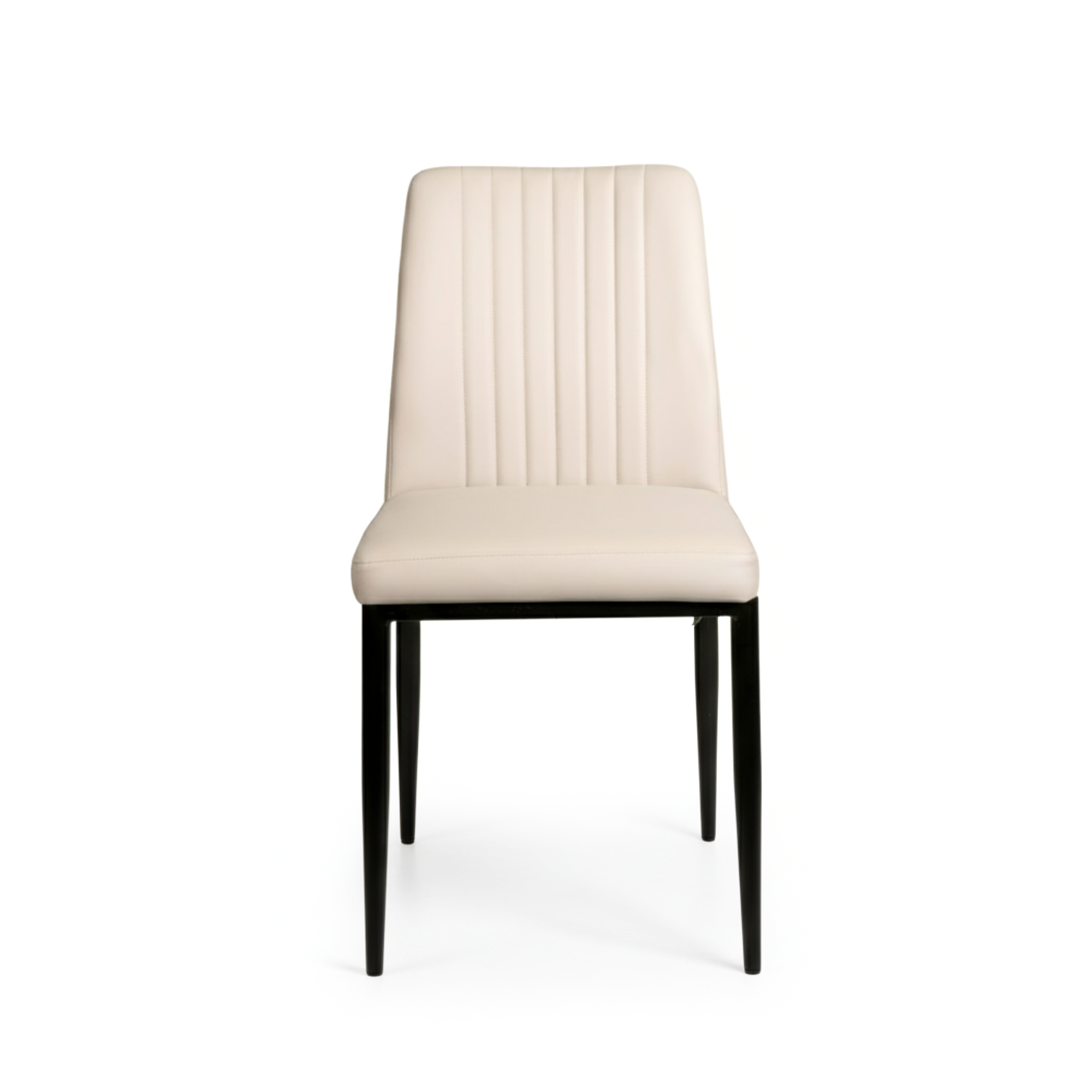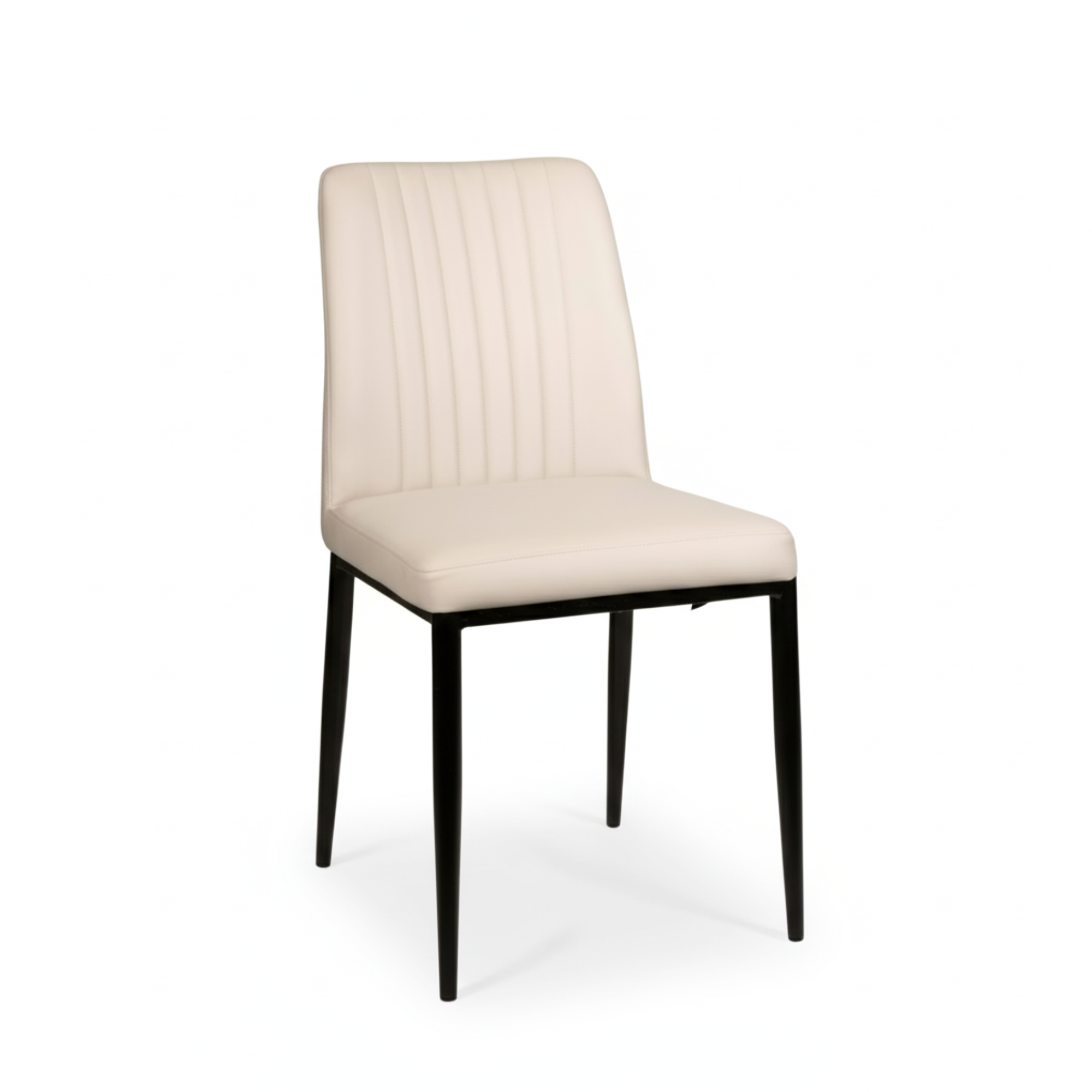 The Slay Dining Chair brings a touch of modern sophistication to any dining space. Upholstered in cream leatherette, it exudes understated elegance while offering durability and easy maintenance. The vertical channel stitching on the backrest adds subtle texture and visual interest, complemented beautifully by the sleek black metal legs. Designed for both style and comfort, the padded seat and supportive back make it perfect for lingering dinners and everyday use alike.