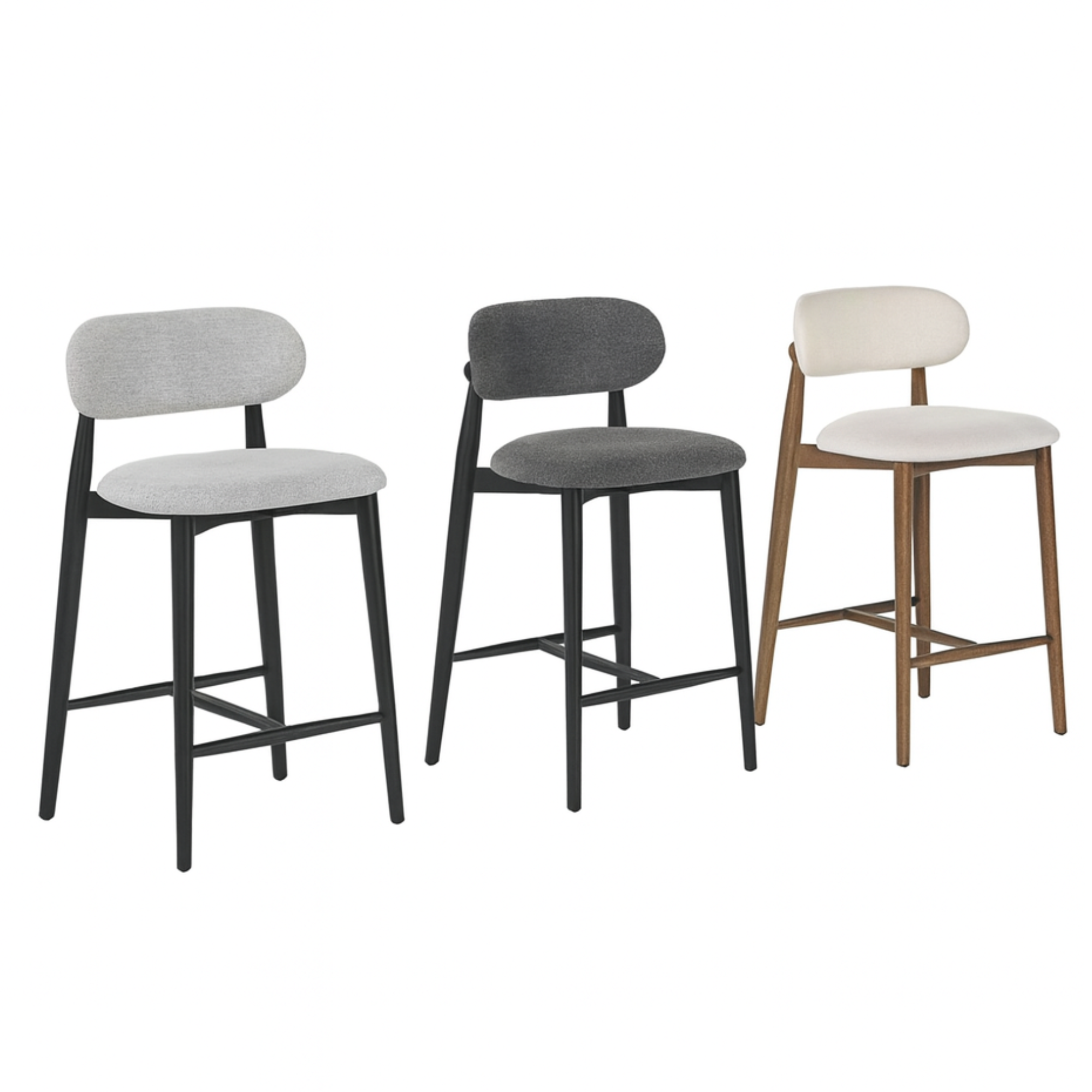 Bright and inviting, this counter chair in light grey linen brings a touch of modern sophistication to any space. The smooth, textured fabric contrasts beautifully with the black wood frame, creating a fresh, timeless look. Its ergonomic design ensures comfort and stability, making it an effortless choice for breakfast counters or open-concept kitchens.