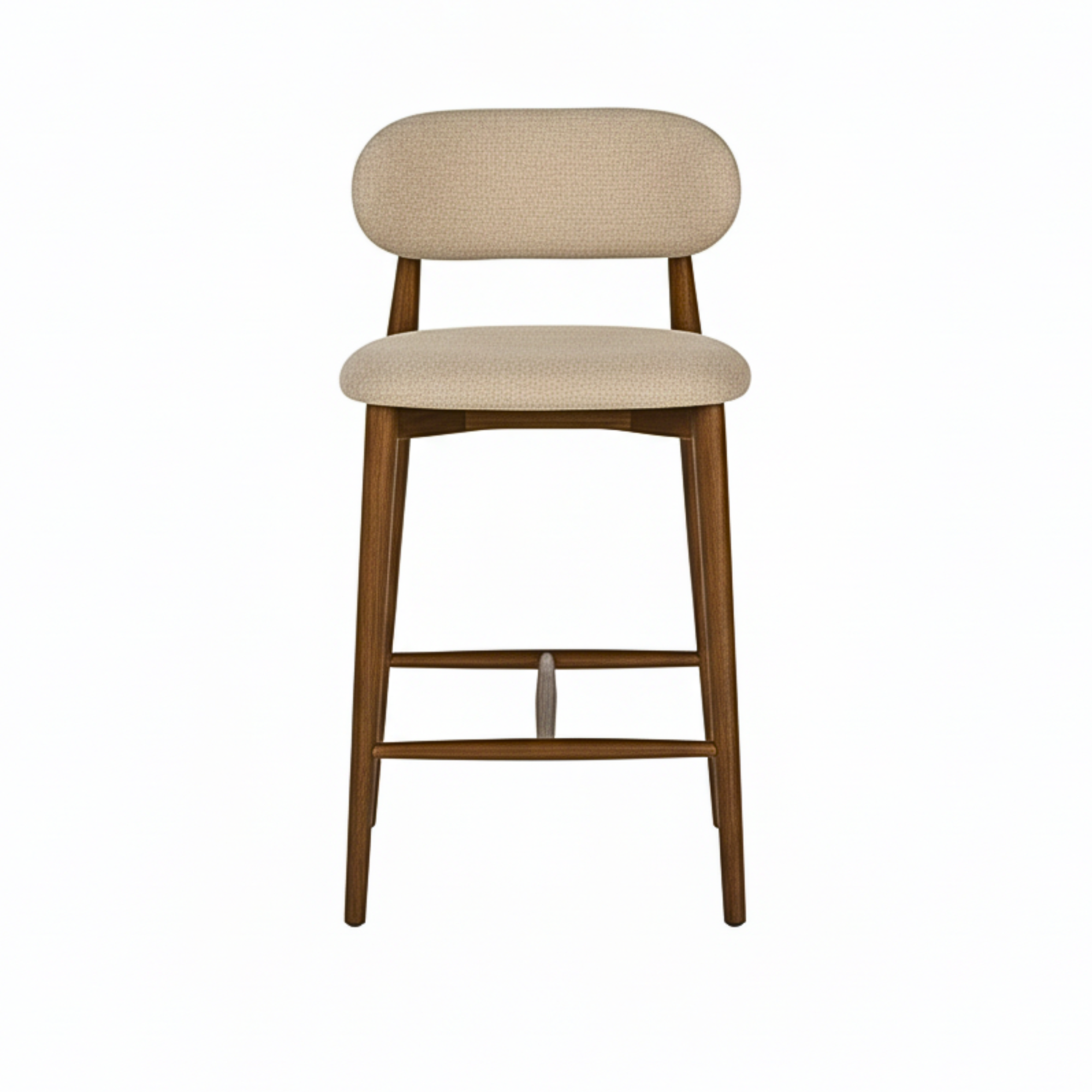 Warm and elegant, this counter chair in beige linen exudes mid-century charm. The neutral fabric pairs seamlessly with the walnut veneer wood legs, creating a natural, inviting look that complements a variety of interiors. With its gently rounded seat and backrest, it offers both comfort and style perfect for everyday dining or relaxed gatherings.