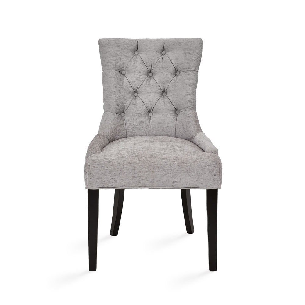 Crafted with dark walnut finished solid wood and premium fabric material, this pleasant contemporary chair is wrapped in solid colour upholstery with button tufts on the chair back and silver nail-head trim on the side.